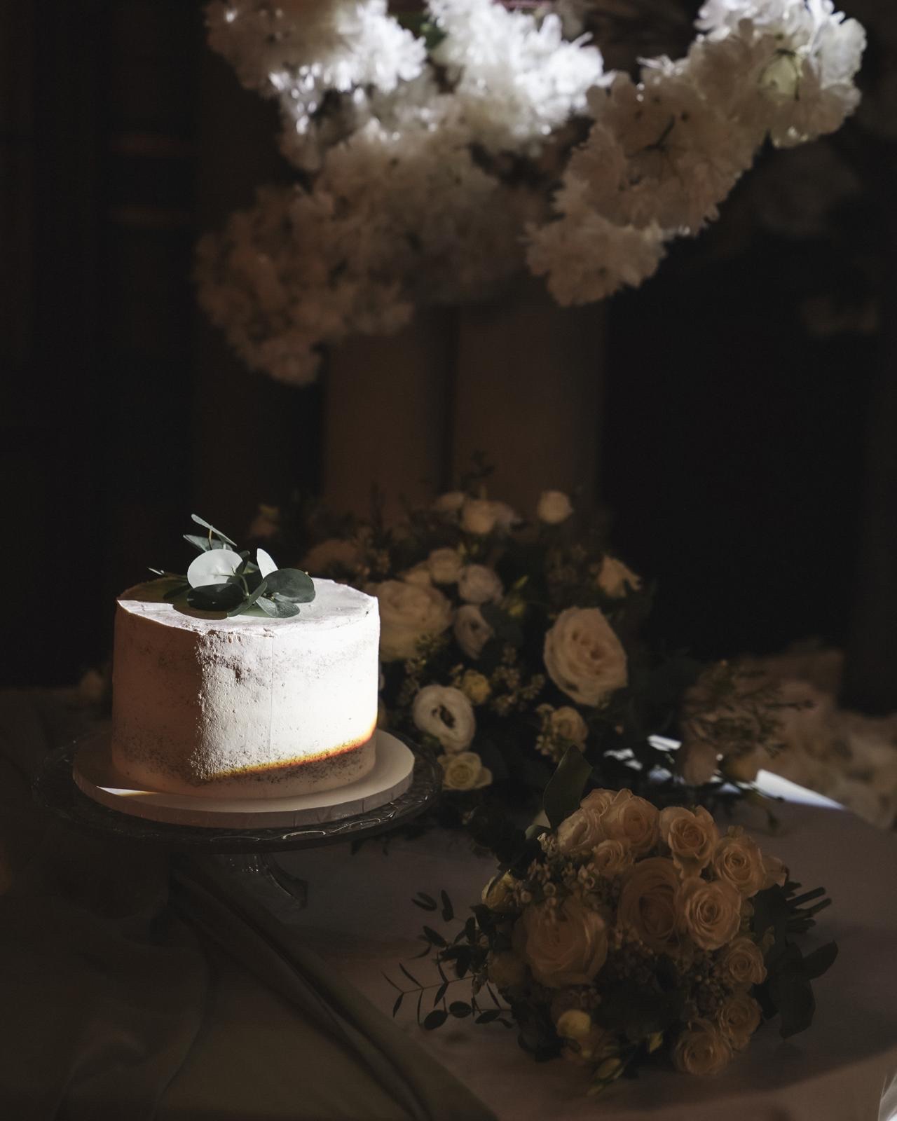 A semi naked one tier 8 inch round celebration cake